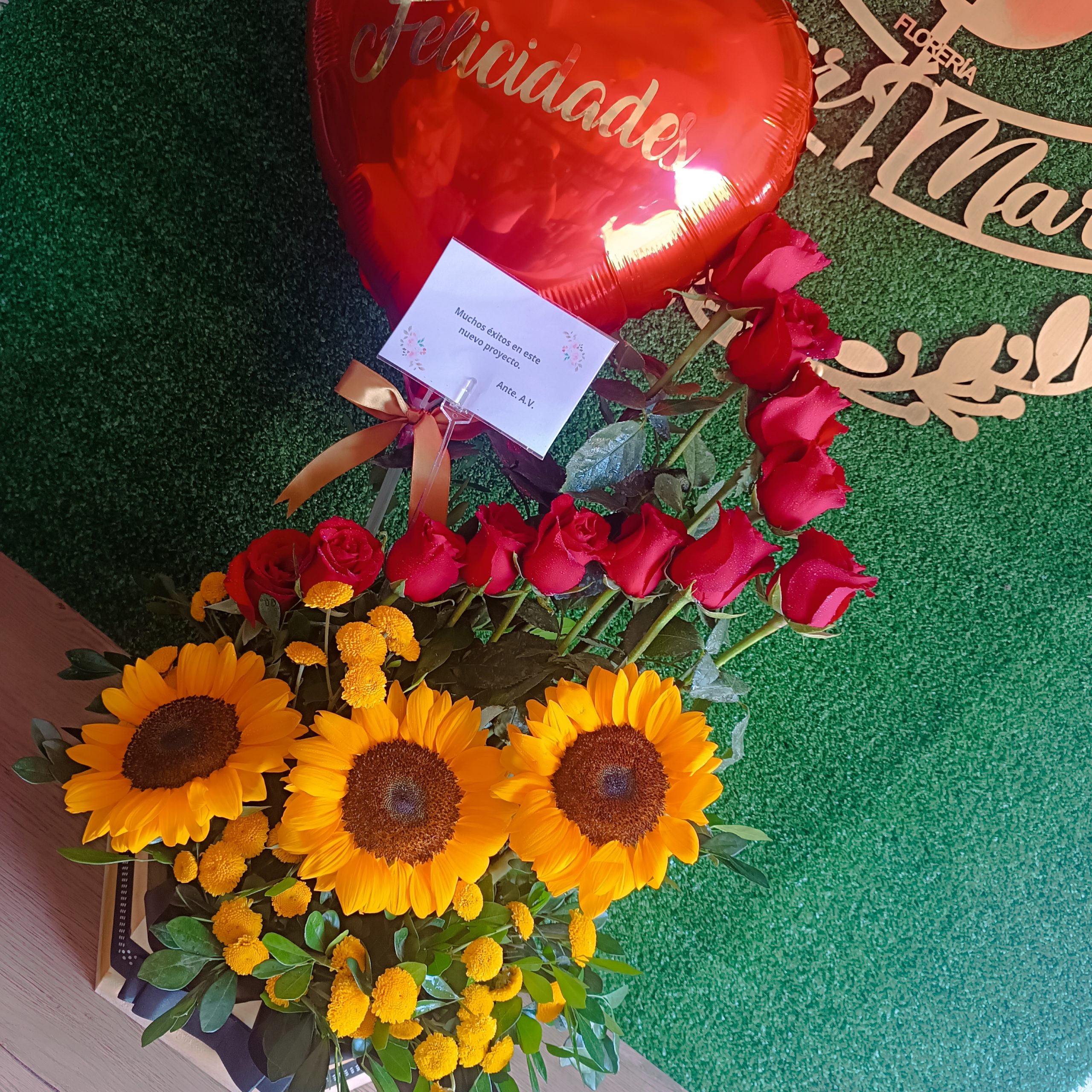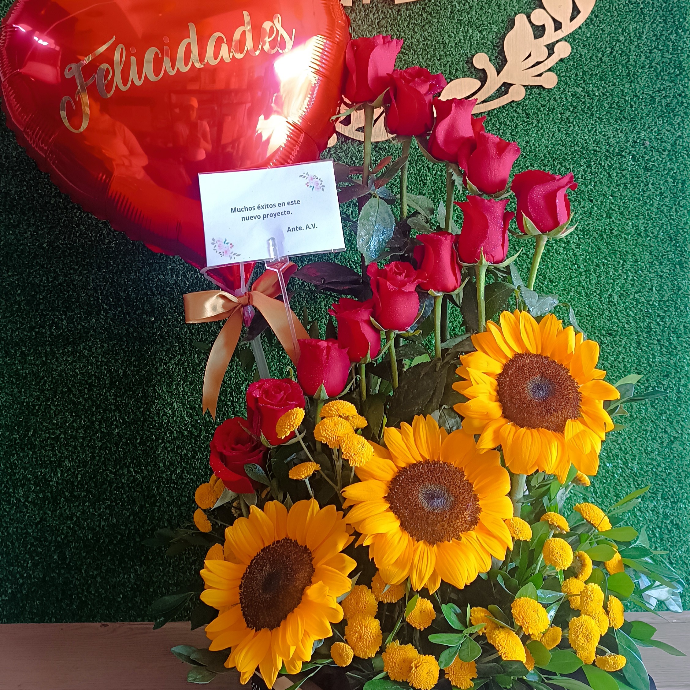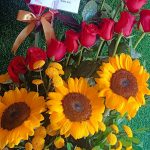 Contiene 03 Girasoles, 24 Rosas rojas, follaje de temporada en Box de madera color natural medida 25 x 10 con lazo de cinta satinada.