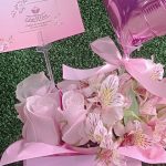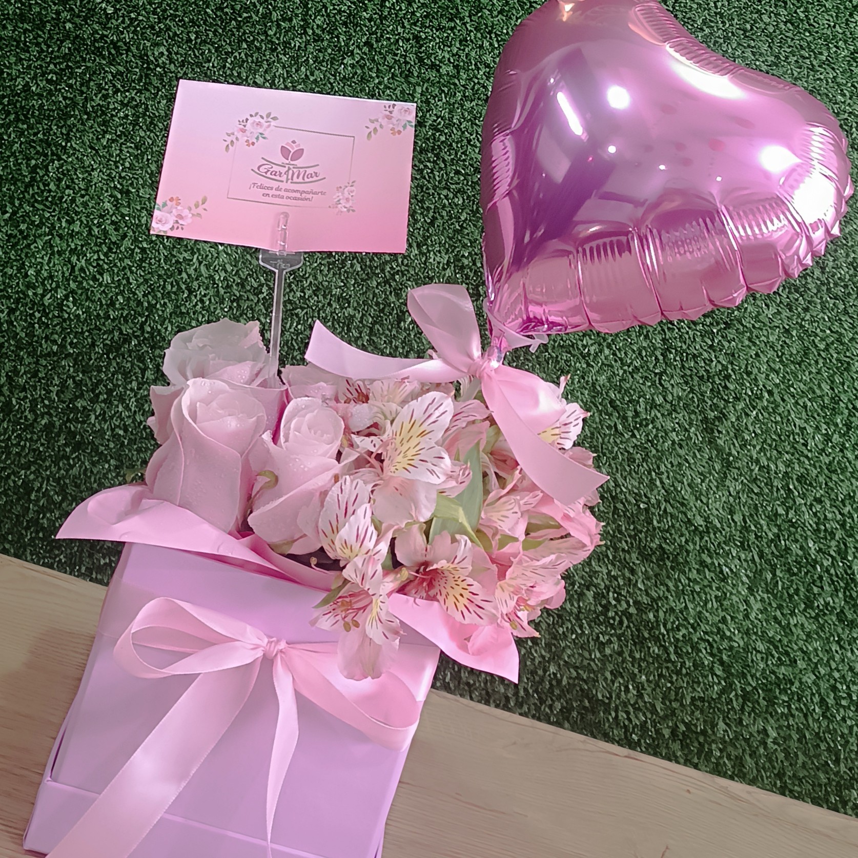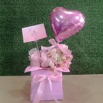 Contiene 06 Rosas rosadas, follaje de temporada en Box Blanco medida 15×15 con lazo de cinta satinada.