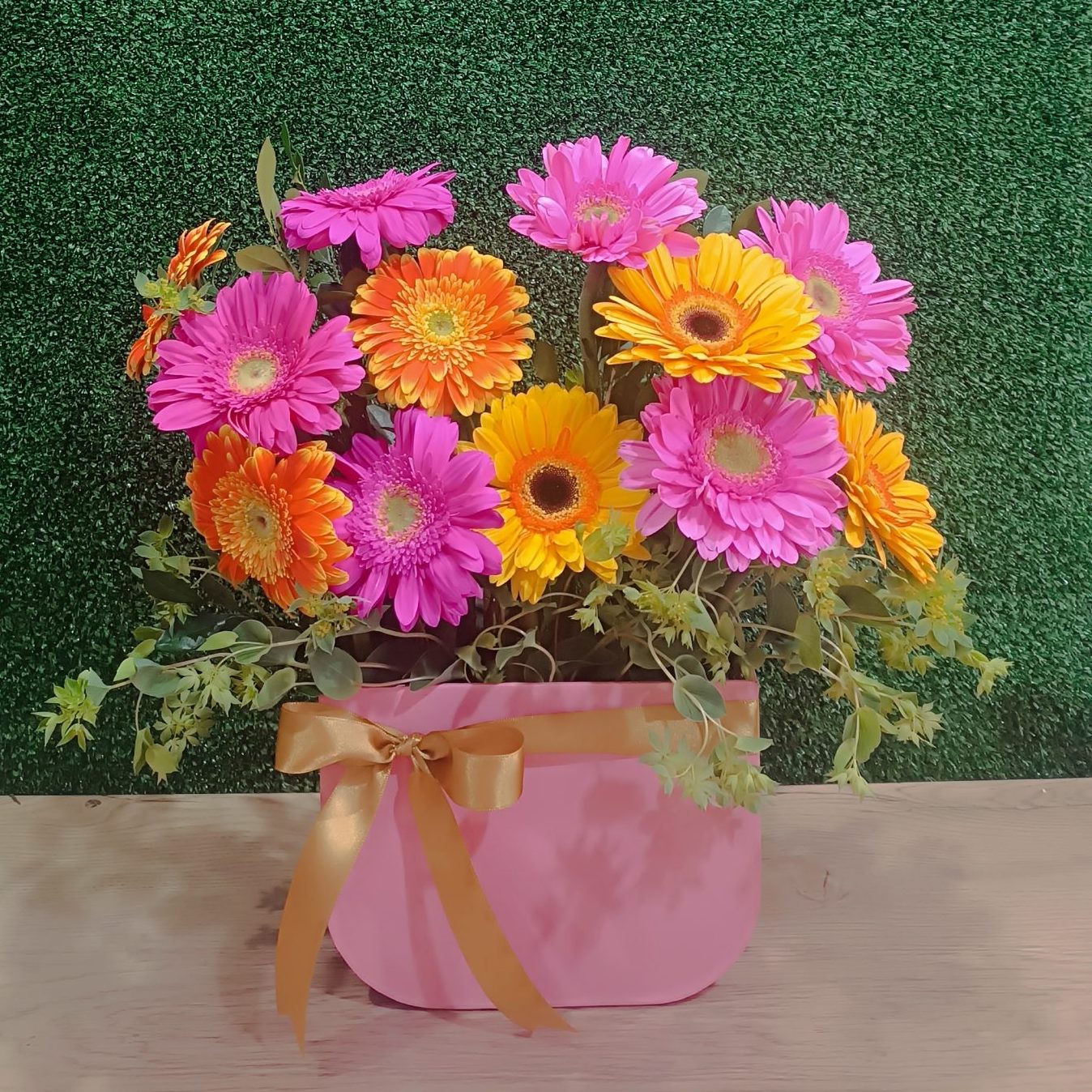 Contiene 12 Gerberas colores variados, follaje de temporada en box rosado con lazo de cinta satinada. ❣️Incluye de Obsequio Dedicatoria Computarizada y Globito❣️