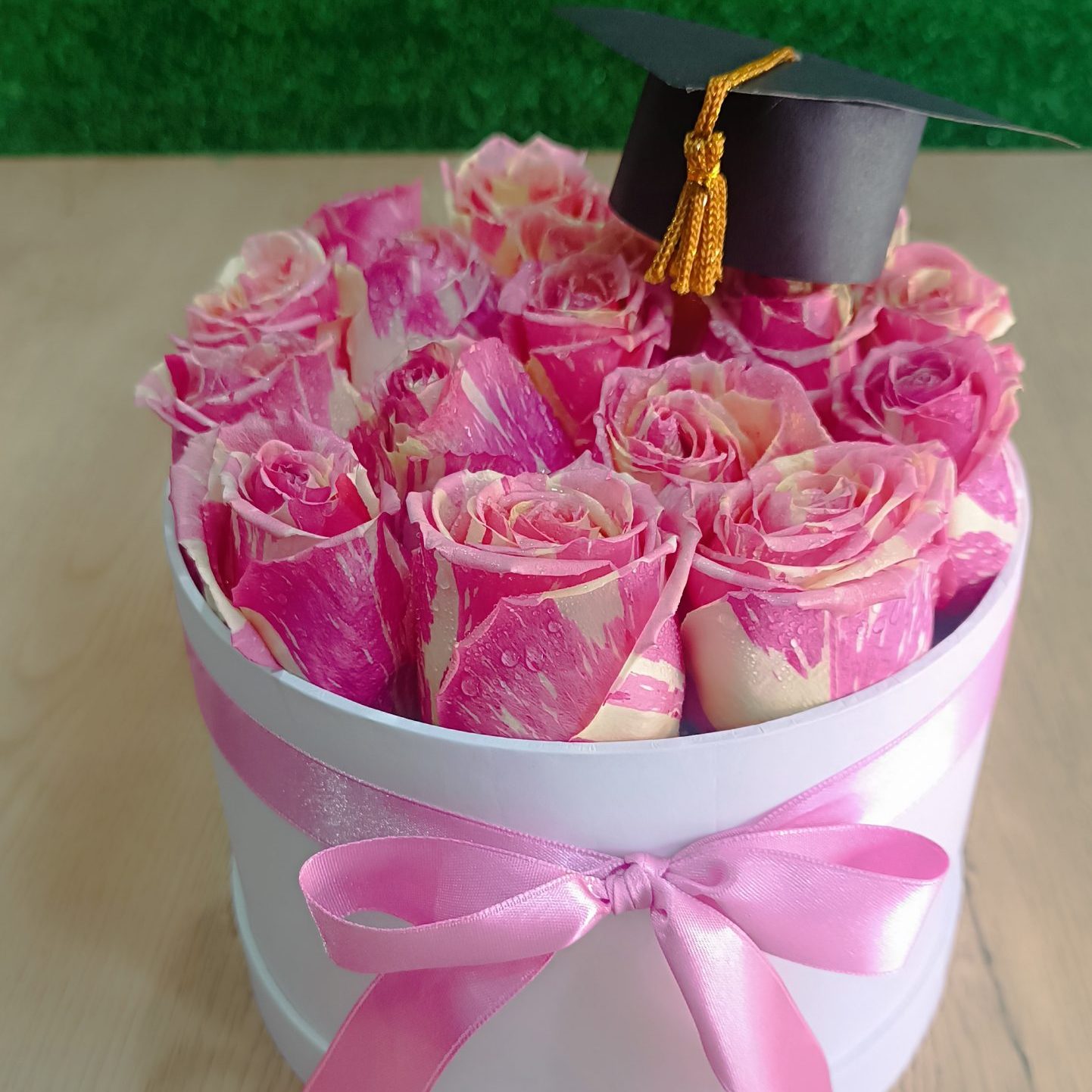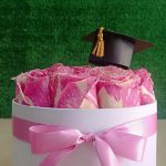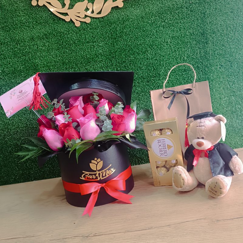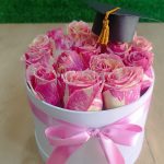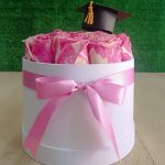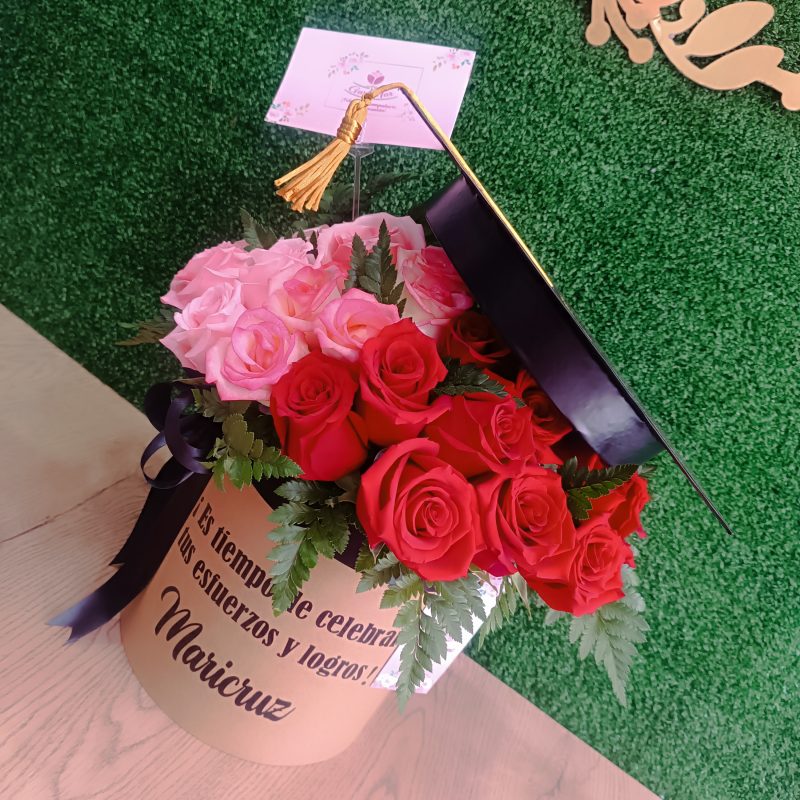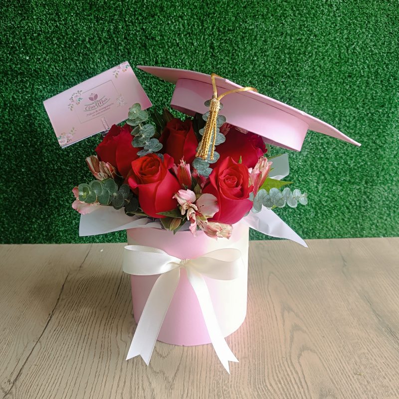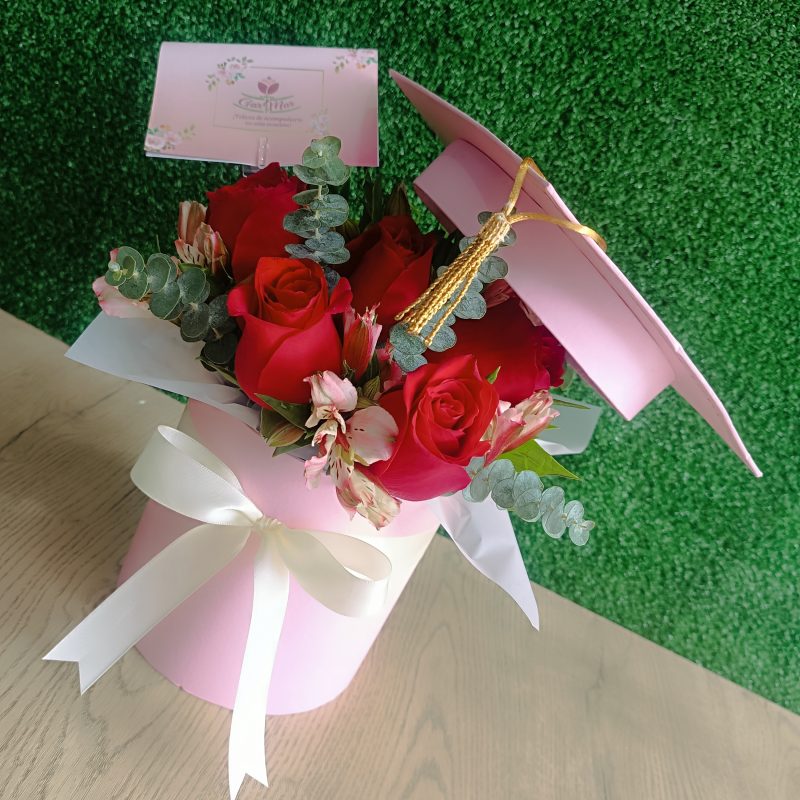 Contiene 20 Rosas rosadas importadas en un Box de Graduados color blanco medida 20 x 15 con lazo de cinta satinada.