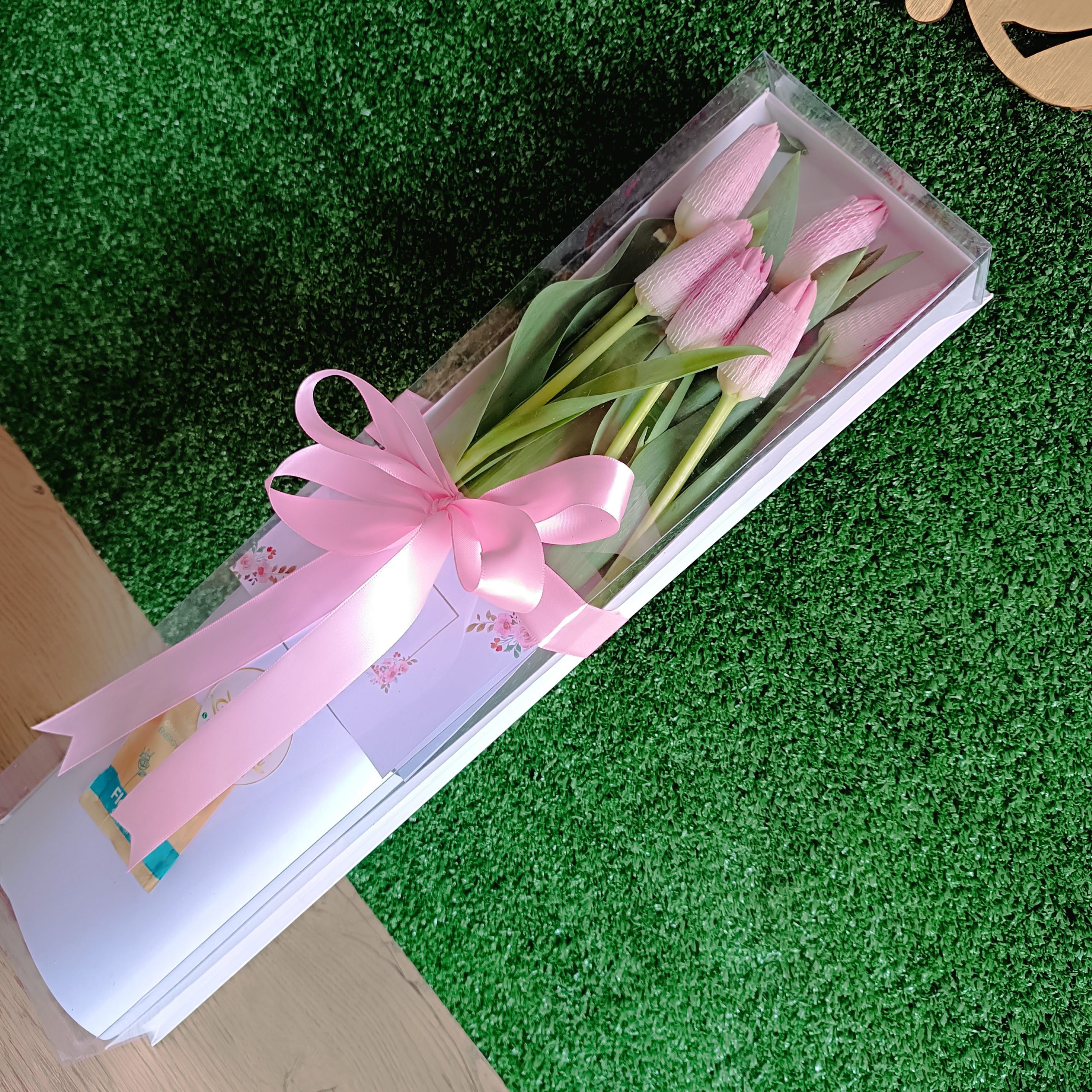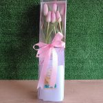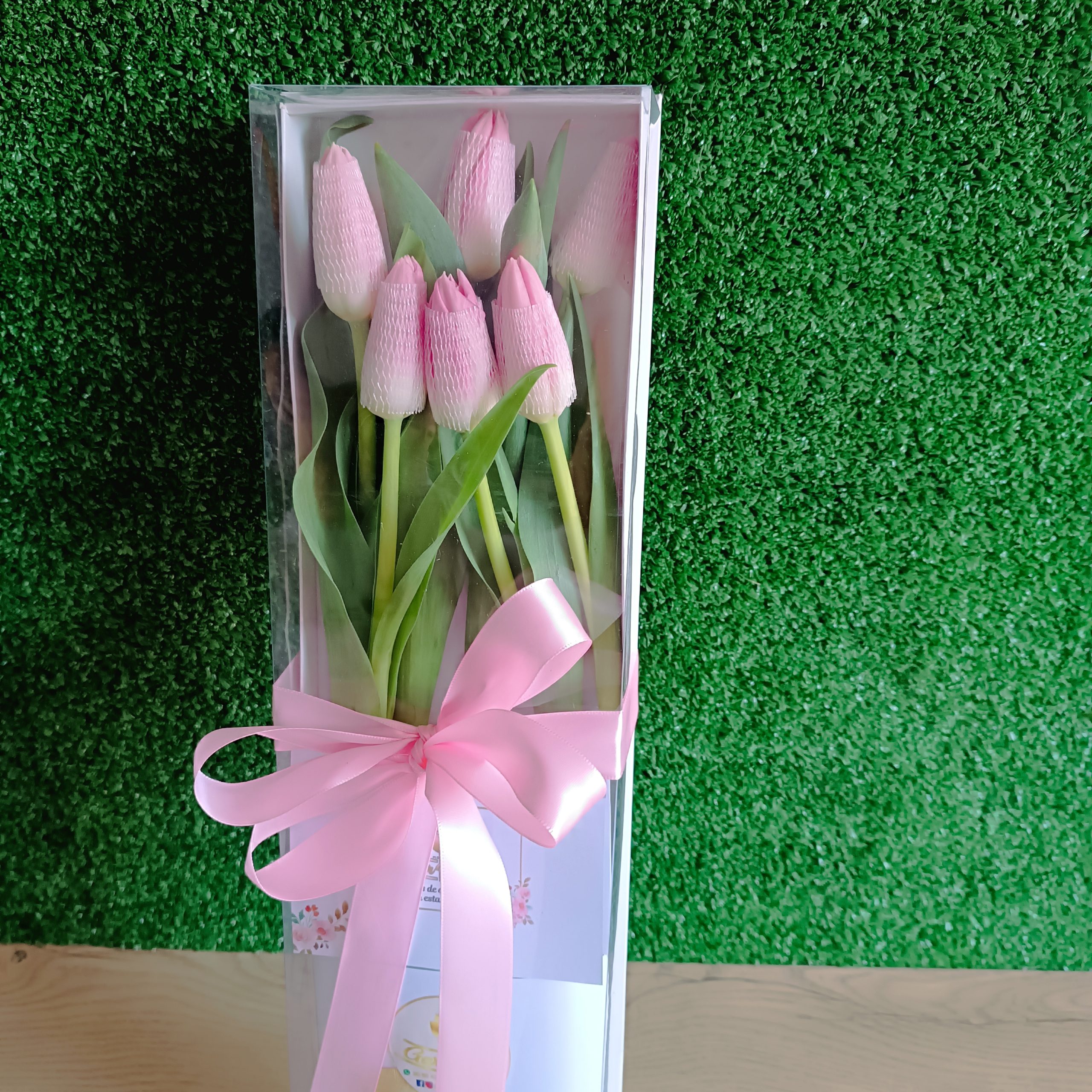 Contiene 06 Tulipanes Rosado en caja larga medida  42cm x 13cm  con lazo de cinta satinada.