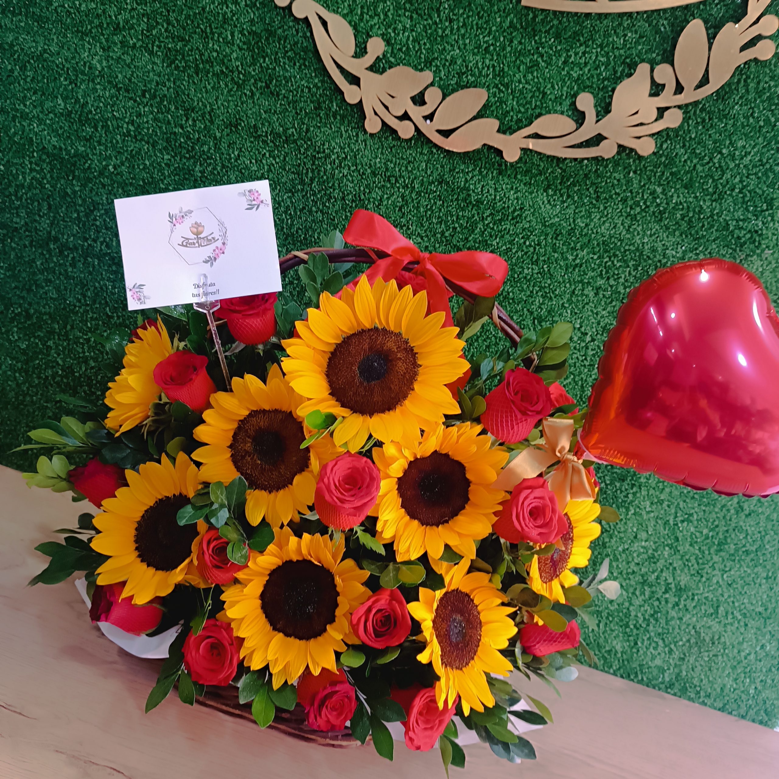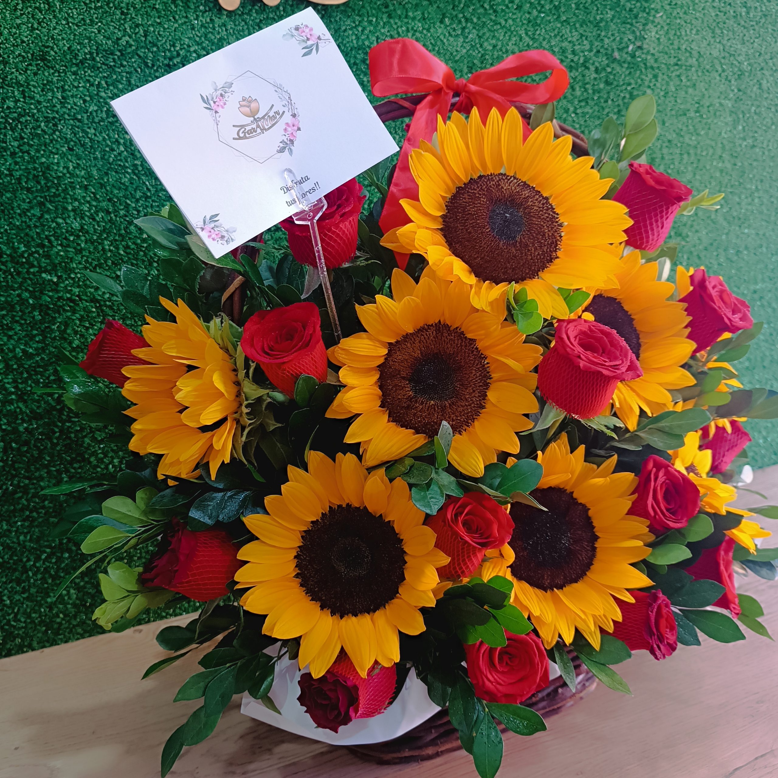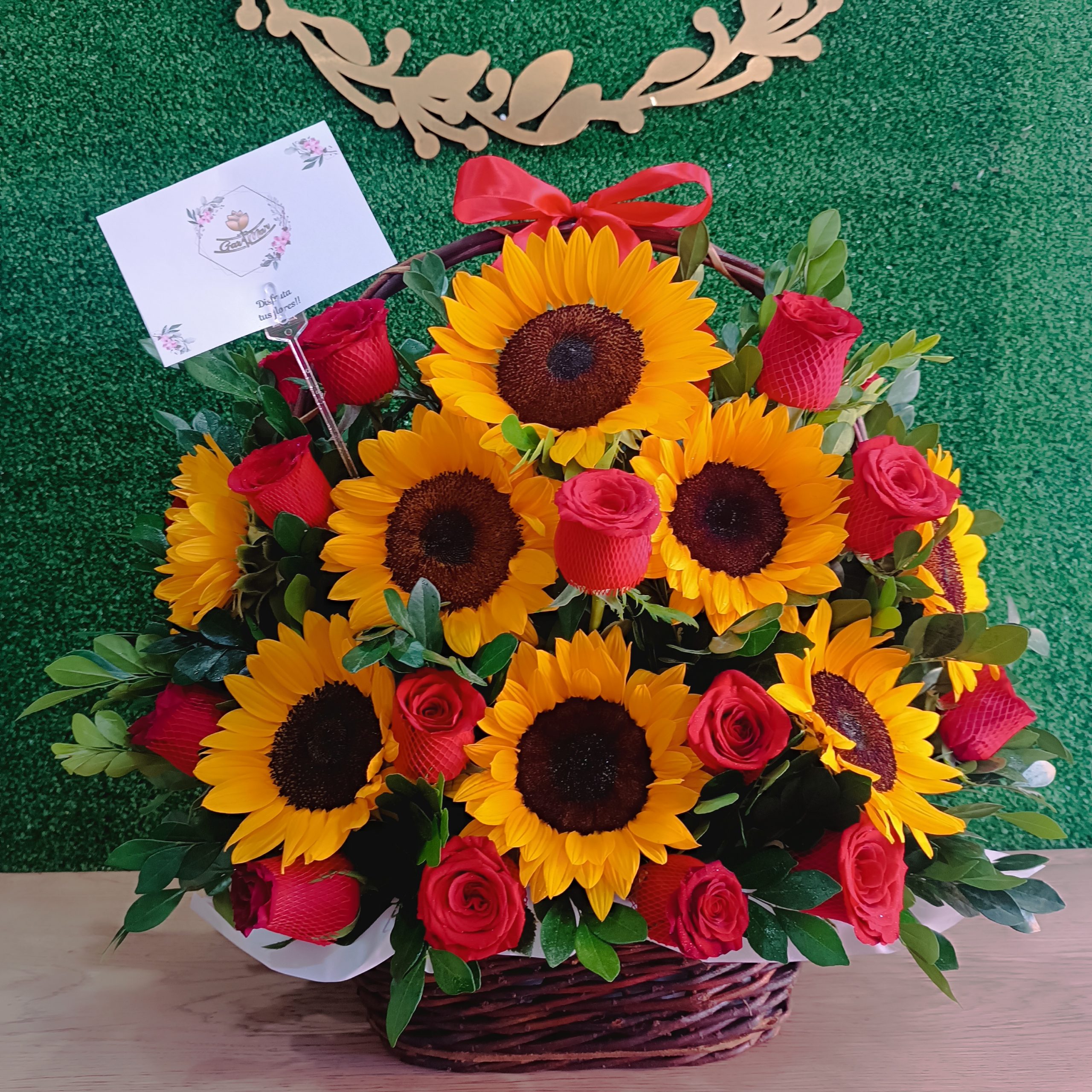 Contiene 08 Girasoles, 12 rosas Rojas, follaje de temporada en una canasta artesanal con lazo de cinta satinada.