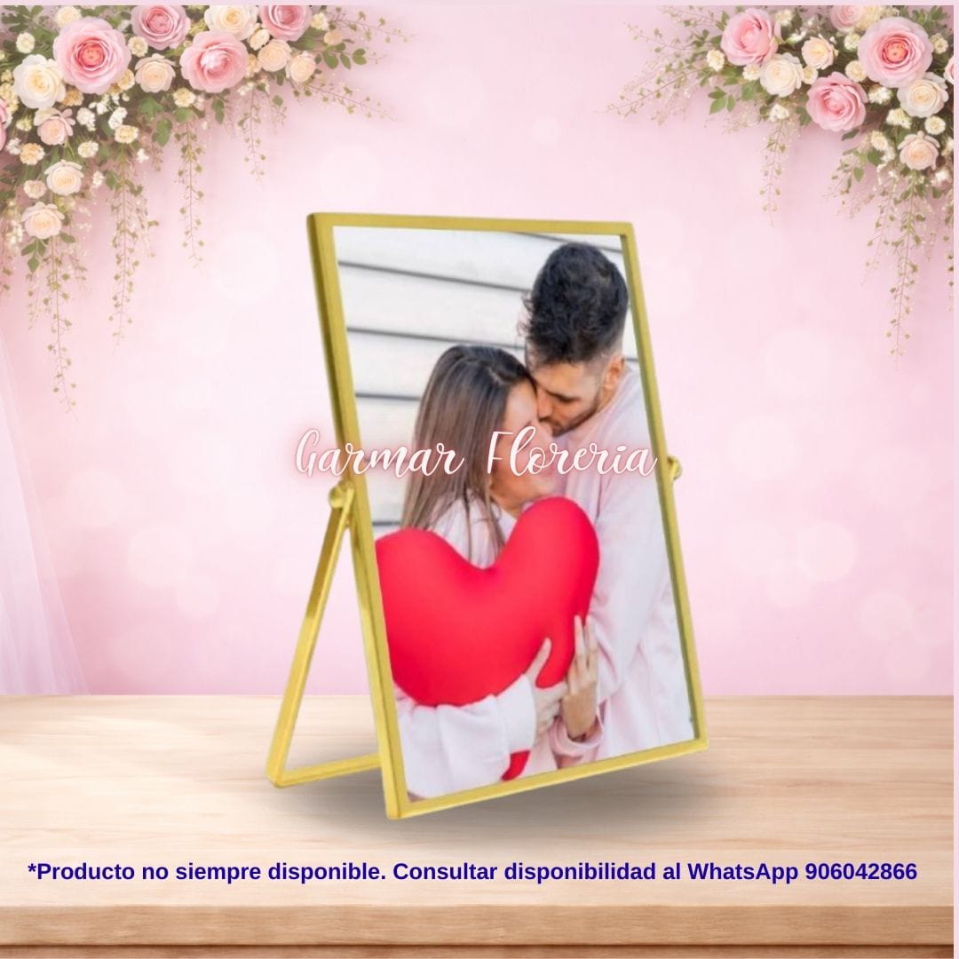Muestra tus recuerdos más preciados con este elegante portarretrato en color dorado. Con un diseño moderno y tamaño perfecto para fotos de 23cm x 18cm y complementar tu Arreglo Floral para que sea el detalle perfecto !!!!