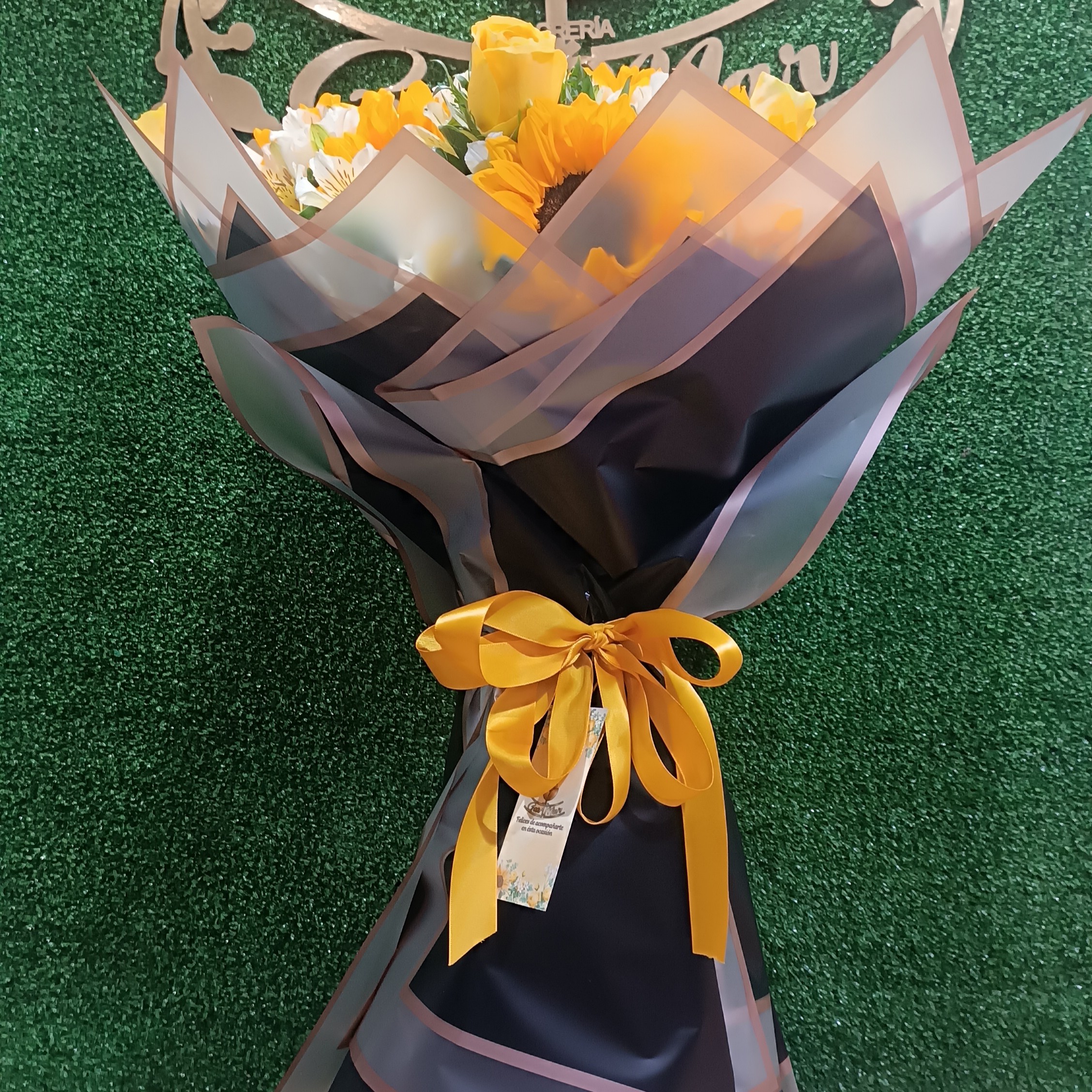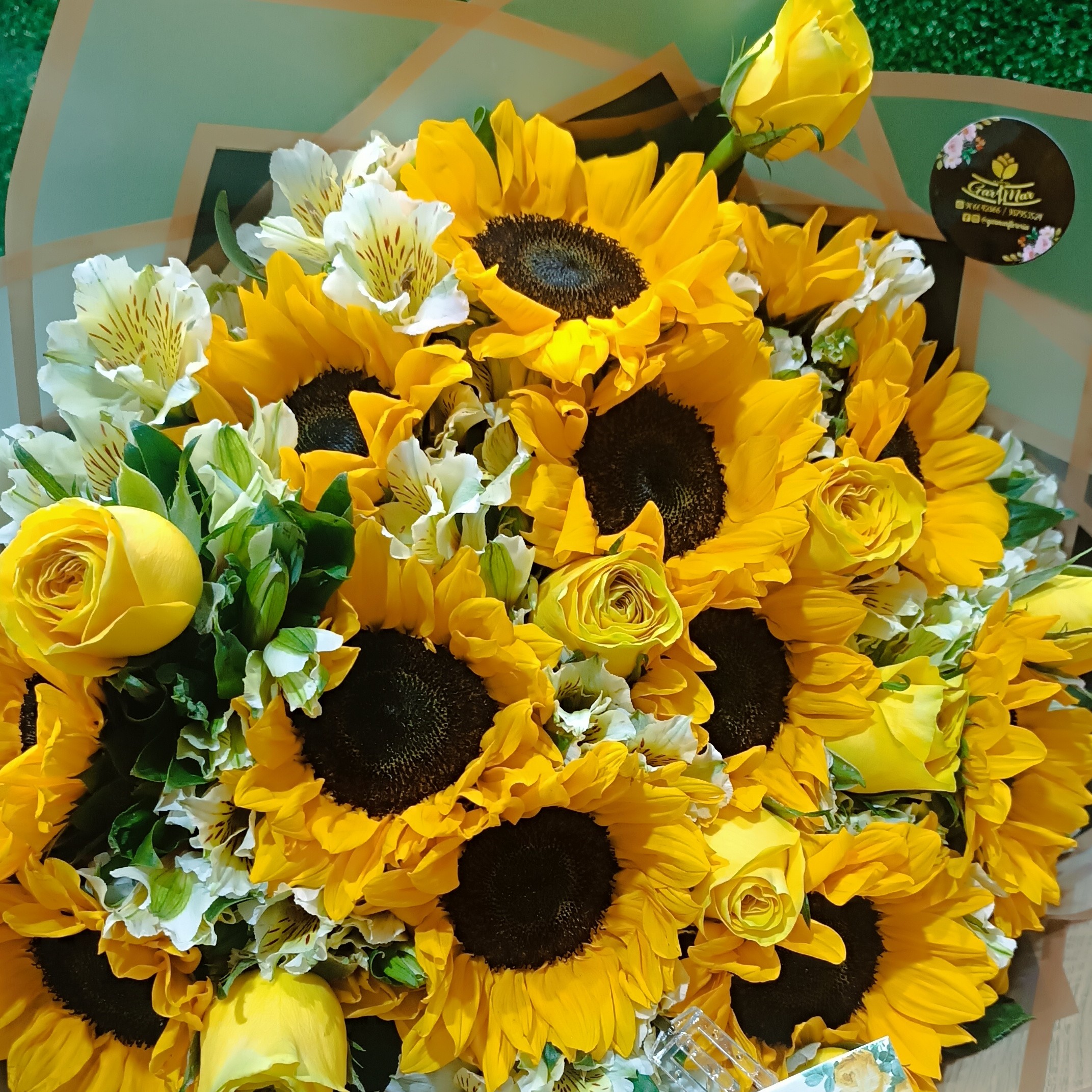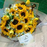 Contiene 12 Girasoles, 12 Rosas Amarillas, follaje de temporada en una envoltura especial de Papel Coreano con lazo de cinta satinada.