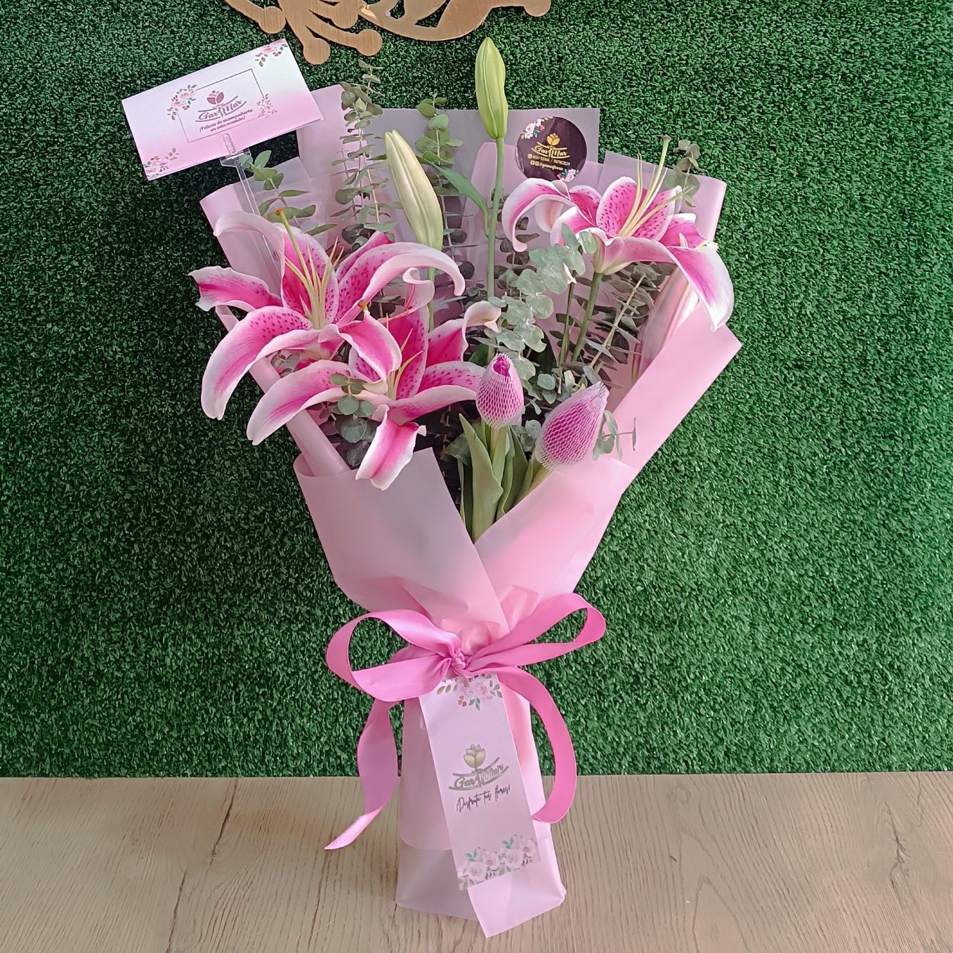 Contiene 03 Lirios en color rosado, follaje de temporada en una envoltura especial de Papel Coreano con lazo de cinta satinada. ❣️Incluye de Obsequio Dedicatoria Computarizada y Globito❣️