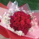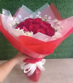 Contiene 25 rosas rojas, follaje de temporada en una envoltura especial de Papel Coreano con lazo de cinta satinada.