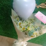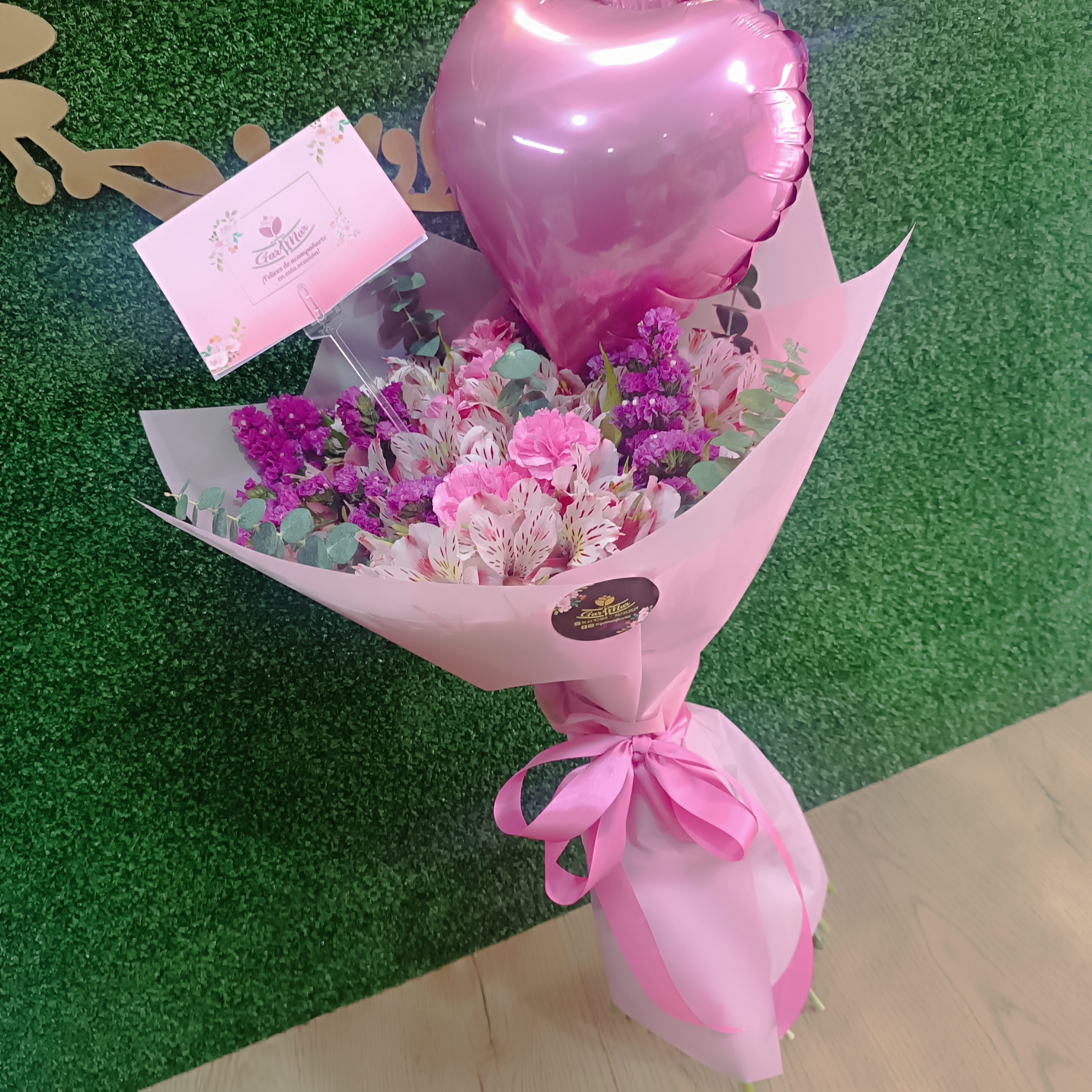 Contiene Astromelías, Clavelinos, Estatis y follajes con envoltura especial de papel Coreano y lazo de cinta satinada.