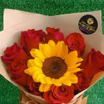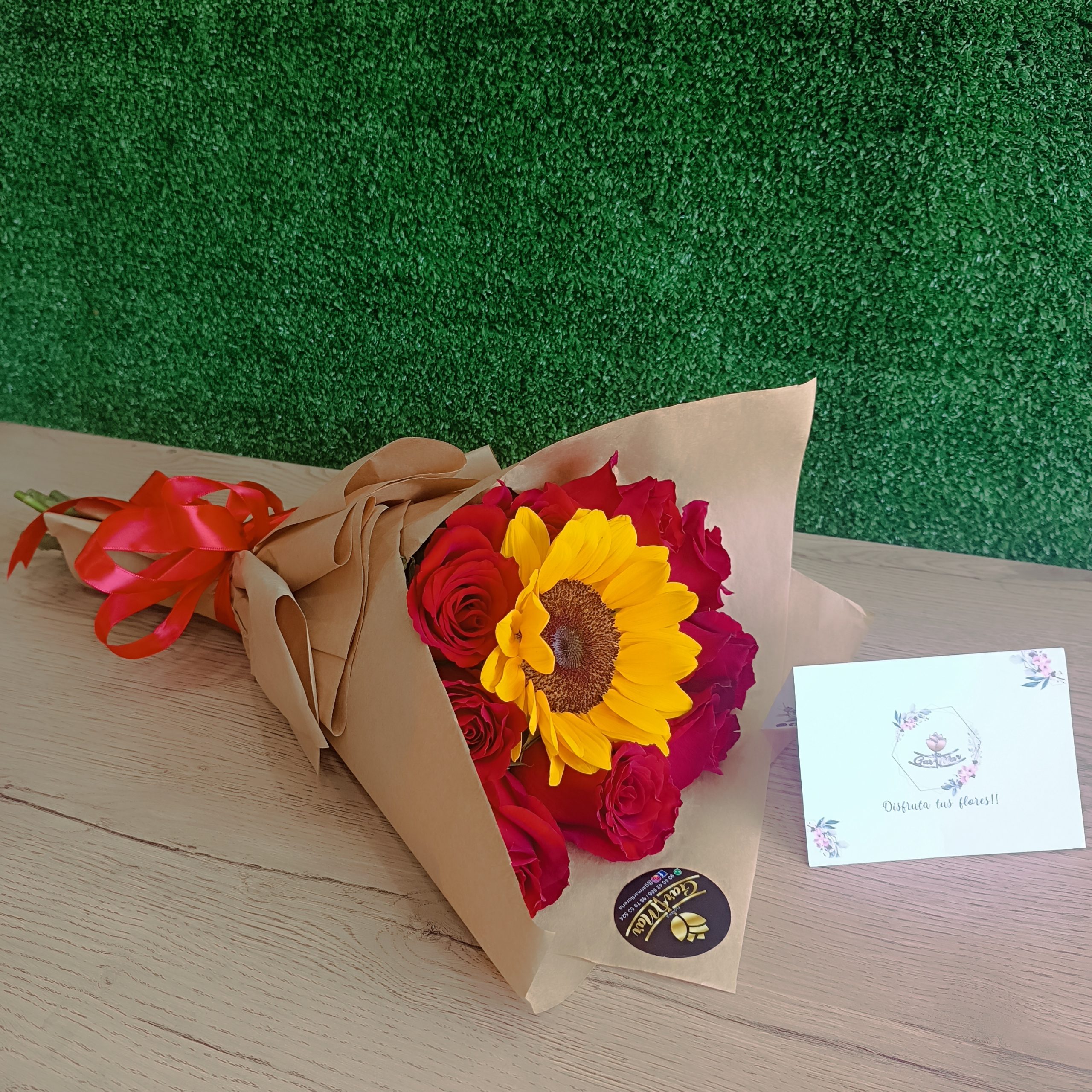 Contiene 08 Rosas rojas, 01 girasol, follaje de temporada en una envoltura especial de Papel Coreano con lazo de cinta satinada.